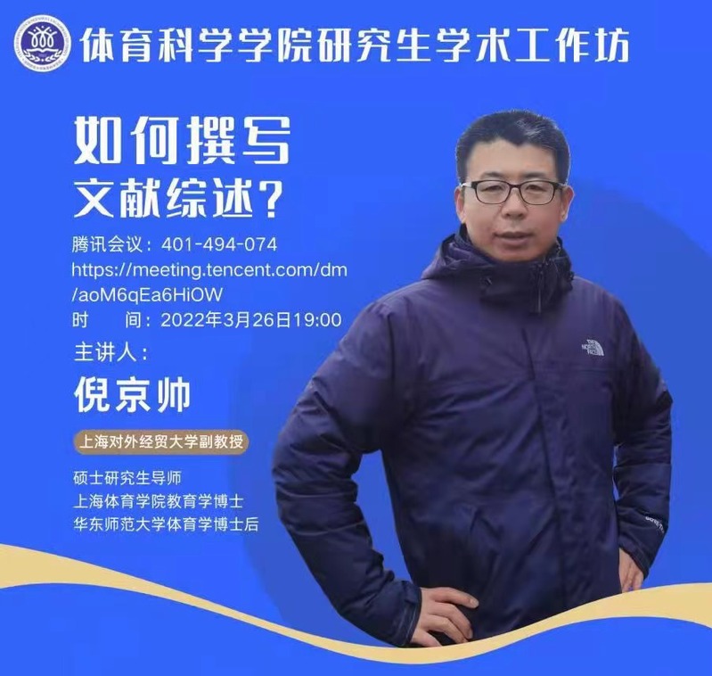 为贯彻落实公司统筹推进疫情防控与内涵发展重点工作专题会议部署,强化和提升校园封闭管理期间研究生在线学习质量,进一步拓宽研究生的知识面,活跃学术气氛。2022年3月26日,EMC易倍在腾讯会议上举办了以“如何撰写文献综述”为主题的学术系列讲座。本次讲座邀请到了上海对外经贸大学副教授、硕士研究生导师、上海EMC易倍教育学博士、华东师范大学体育学博士后倪京帅老师主讲,旨在为同学就如何搜索文献、写好文献综述提供帮助,也为接下来研究生学习期间论文写作与科研能力提升打好基础,EMC易倍全体研究生观看了讲座。