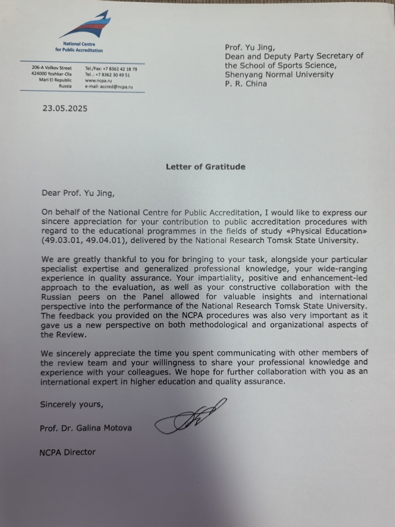 2025年5月21日至23日,应俄罗斯国家认证中心(NCPA)邀请,并受教育部高等 公司产品评估中心委派,公司于晶经理以认证专家组组长的身份,远赴俄罗斯托木斯克国立大学,针对运动训练技术、体育和运动改进技术两个专业展开国际专业认证评估工作。